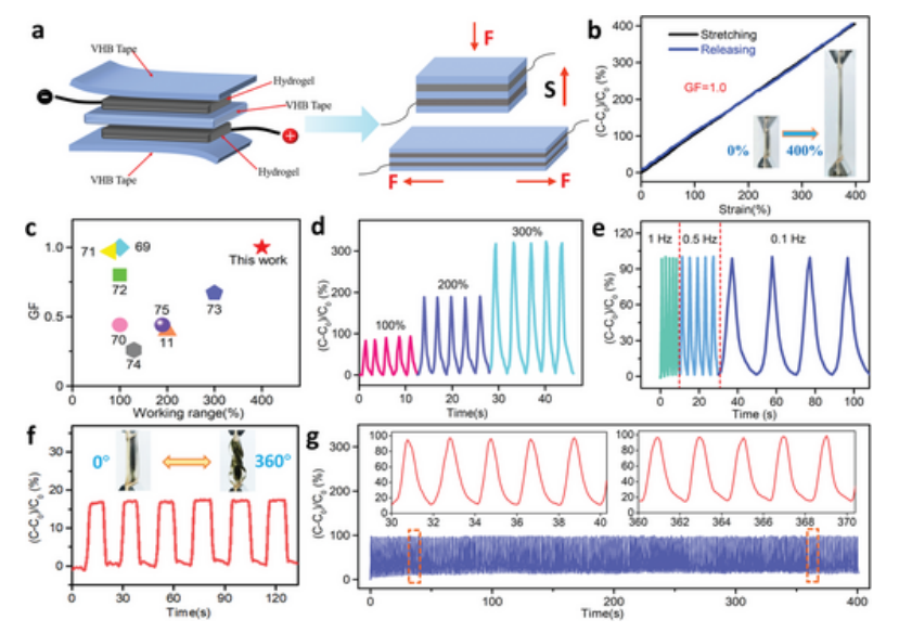Fig 5. a) 基于 PMP 水凝膠的電容傳感器的示意圖。 b) PCSS 的相對(duì)電容變化作為應(yīng)變的函數(shù)。c) PCSS 與報(bào)道的電容式傳感器在 GF 和工作范圍方面的比較。 d,e) 不同應(yīng)變和頻率下重復(fù)加載-卸載試驗(yàn)下的相對(duì)電容變化。 f) 循環(huán) 0° 至 360° 扭轉(zhuǎn)測(cè)試期間的相對(duì)電容變化。 g) 100%應(yīng)變下重復(fù)加卸載試驗(yàn)下PCSS的相對(duì)電容變化。