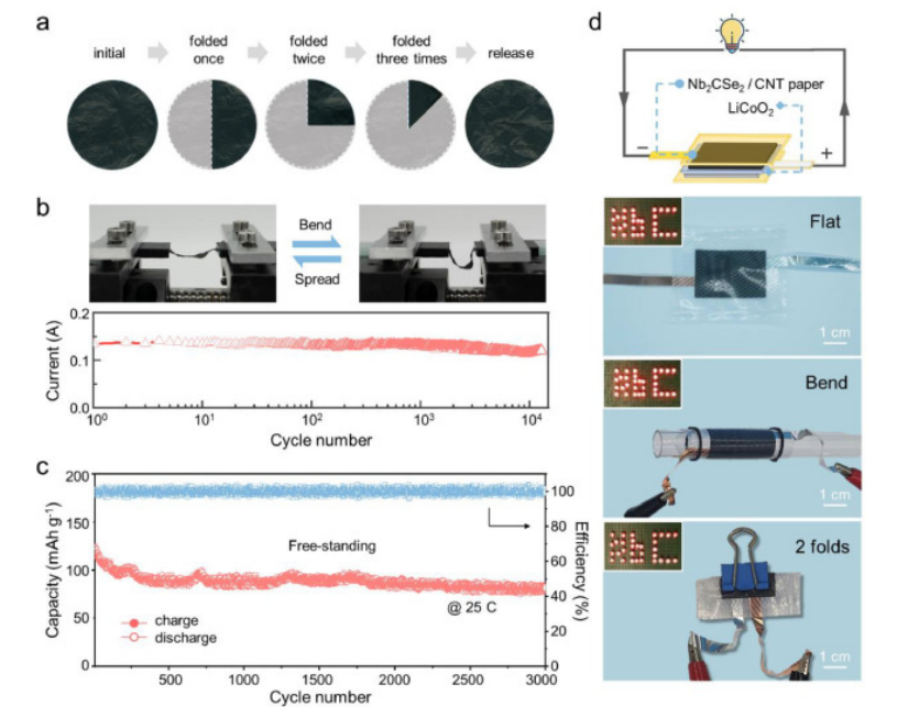 Fig 4. 圖 4. (a) Nb2CSe2/CNTs 紙折疊過程中無斷裂的數(shù)碼照片。 (b)“彎曲-擴展”循環(huán)期間的電性能測量。(c)Nb2CSe2/CNTs紙在25℃下的循環(huán)性能。(d)LiCoO2||Nb2CSe2/CNTs柔性全電池示意圖及可行性測試。