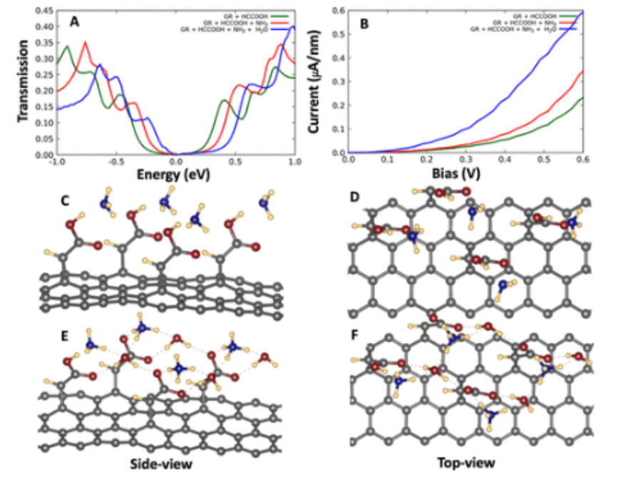 圖7.面板(A)在氨(紅色)存在下和每個羧酸官能團添加一個水分子(藍色)后,裸露(綠色)g7×7/1a納米片在不同能量下的電子透射圖。面板(B)模擬了在存在氨(紅色)和添加水(藍色)后,裸露(綠色)g7×7/1a納米片在不同電位偏壓下的電流密度。面板(C,D)包含與氨分子相互作用的功能化石墨烯層的球和棒表示的不同視圖。面板(E,F(xiàn))包含添加水分子后與氨分子相互作用的功能化石墨烯層的球和棒表示的不同視圖。虛線表示由羧酸根離子、銨離子和水分子在改性石墨烯表面上建立的氫鍵網(wǎng)絡。