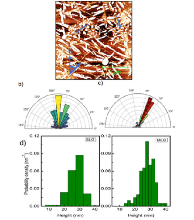 2 AFM圖像。高度刻度為20納米。白色棒狀特征代表褶皺上的并五苯島。(b) 顯示石墨烯層上的島相對于面板(a)中所示圖像的垂直軸的角度分布的直方圖。(c) 石墨烯折疊角度分布的極性直方圖。(d) SLG(最左邊的直方圖)和MLG(最右邊的直方圖)上島嶼高度的概率密度直方圖。數(shù)據(jù)來自面板(a)中所示的島嶼。