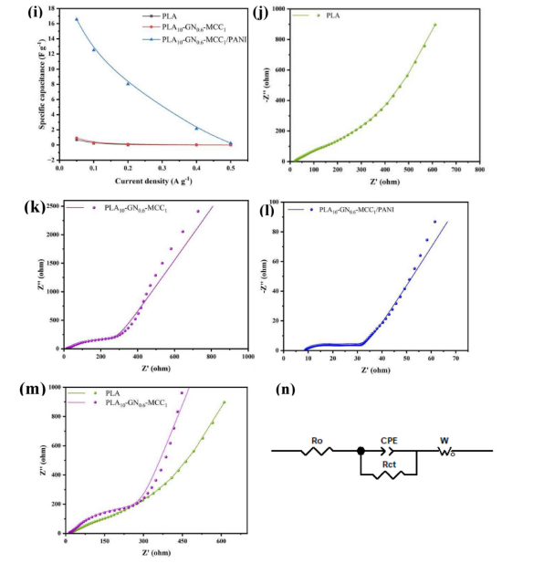 4電解液中的Nyquist圖;(m)純PLA與PLA