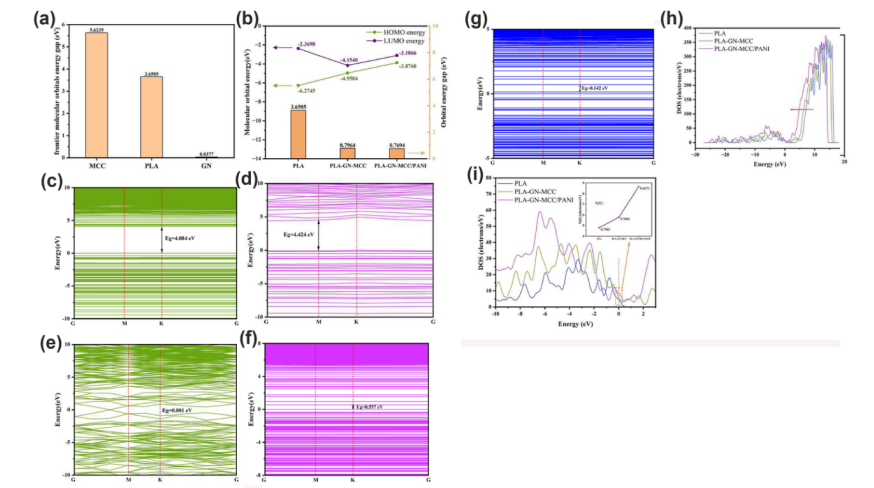 圖8. (a) MCC、PLA和GN的前線分子軌道能隙;(b) PLA、PLA-GN-MCC和PLA-GN-MCC/PANL的HOMO能、LUMO能和前線分子軌道能隙。(c) PLA, (d) MCC, (e) GN, (f) PLA-GN-MCC和(g) PLA-GN-MCC/PANL的能帶結(jié)構(gòu)。 PLA、PLA-GN-MCC和PLA-GN-MCC/PANI的(h)總體和(i)局部態(tài)密度圖。