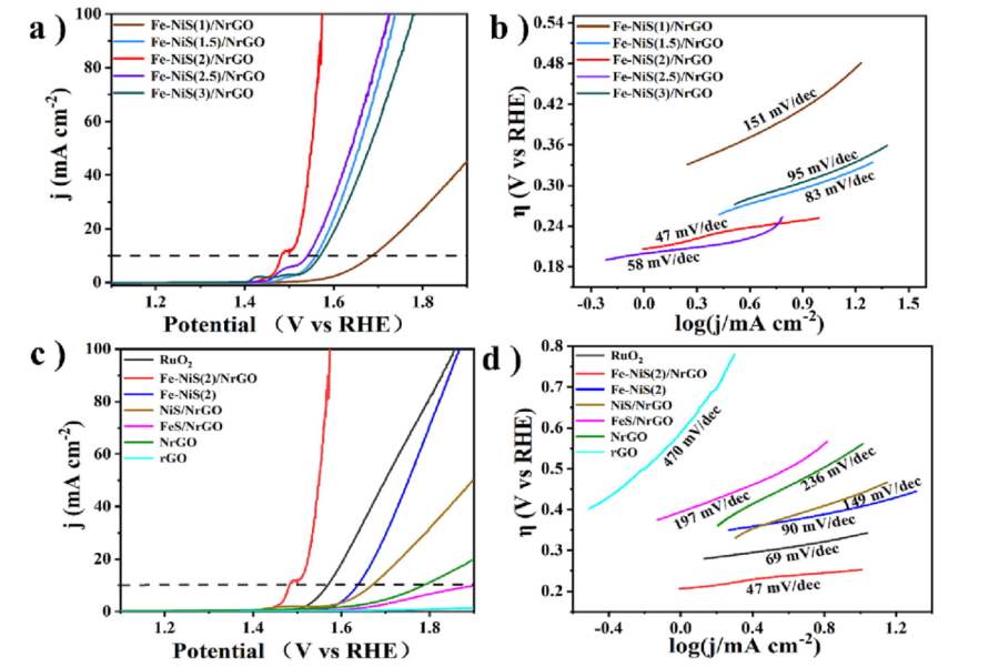 -2時的電流密度)和Tafel圖。b) rGO、NrGO、FeS/ NrGO、NiS/NrGO、Fe-NiS(2)、Fe-NiS(2)/NrGO和RuO
