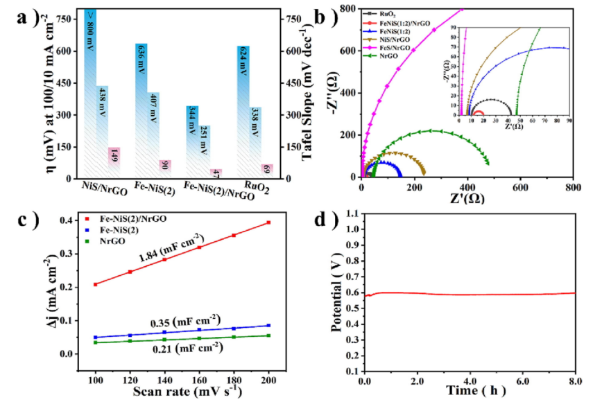 2的電化學阻抗譜。c) Fe-NiS(2)、Fe-NiS(2)/NrGO、NrGO的雙層電容。d) 1.0 M KOH條件下FeNiS(2)/NrGO的時間電位曲線。