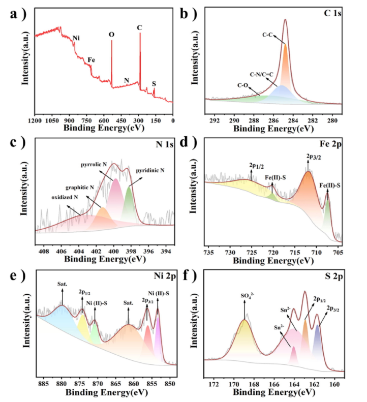 圖5. Fe- NiS (2)/NrGO的XPS峰反褶積X-射線光電子能譜,a)樣品測量譜,b)C1s, c) N1s, d) Fe 2p, e) Ni 2p, f) S 2p。
