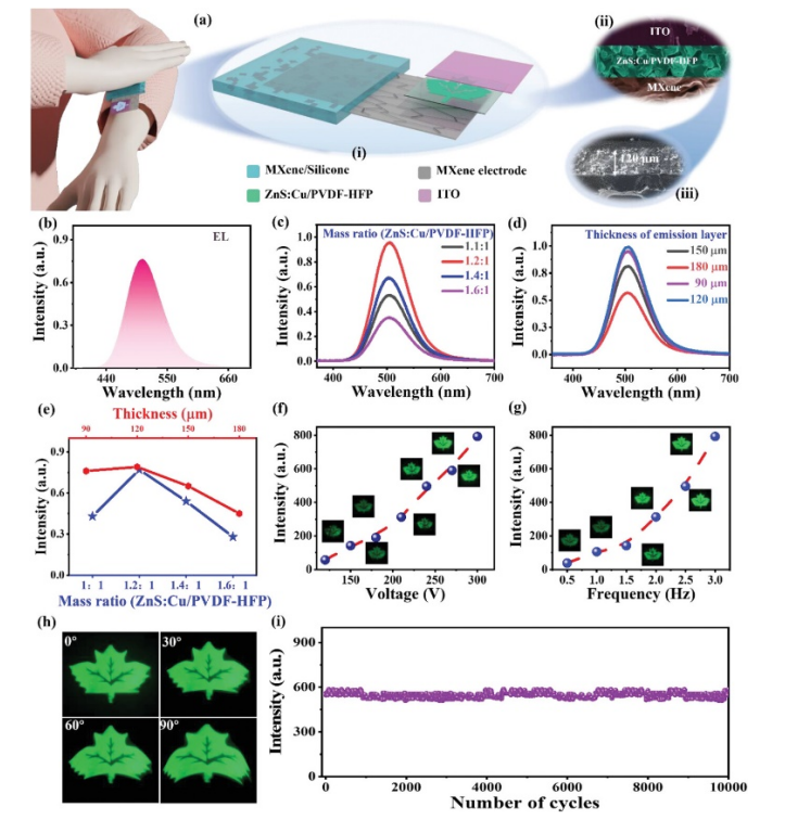 Fig 5. W-ELD 的結(jié)構(gòu)和 EL 特性。a) 基于一體式 MXene 電極的 W-ELD 示意圖。 b) W-ELD 的 EL 光譜。c) EL 強(qiáng)度對(duì) ZnS: Cu 磷光體與 PVDF-HFP 質(zhì)量比 (1.1–1.6) 的依賴(lài)性。d)90-180μm不同厚度的W-ELD的EL強(qiáng)度。e) 不同厚度和ZnS:Cu與PVDF-HFP質(zhì)量比的W-ELD的EL強(qiáng)度。f) 不同驅(qū)動(dòng)電壓(100-300 V)下的EL強(qiáng)度。插圖:不同電壓驅(qū)動(dòng)下EL發(fā)射的相應(yīng)照片。 g)W-ELD在不同工作頻率(0.3-2.5 Hz)下的EL強(qiáng)度。插圖:不同工作頻率下EL發(fā)射的相應(yīng)照片。 h) 不同彎曲條件(0°–90°)下葉型EL發(fā)射的光學(xué)照片。 i) W-ELD 發(fā)射的重復(fù)性和穩(wěn)定性(104 個(gè)循環(huán))。