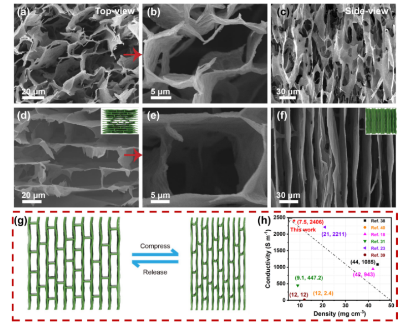 Fig 2. a、b CNT/MXene (1:7) 氣凝膠的頂視圖和 c 側視圖 SEM 圖像。 d、e為CNF/CNT/MXene(2:1:7)氣凝膠的俯視SEM圖和側視SEM圖,插圖為孔結構示意圖。 g CNF/CNT/MXene 氣凝膠 (2:1:7) 壓縮和釋放過程示意圖。 h 與其他MXene基氣凝膠的電導率比較。