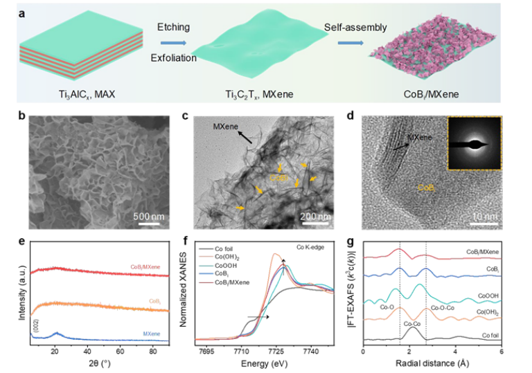 Fig 2. CoBi/MXene 的合成和結(jié)構(gòu)表征 (a) CoBi/MXene 合成策略的示意圖。 CoBi/MXene 的 (b) SEM 和 (c) TEM 圖像。 (d) 具有 CoBi/MXene SAED 圖案(插圖)的 HRTEM 圖像。 (e) 少層 MXene、CoBi 和 CoBi/MXene 的 XRD 圖案。 CoBi 和 CoBi/MXene 的 Co K 邊光譜的 (f) XANES 和 (g) 傅里葉變換 EXAFS (FT-EXAFS)。