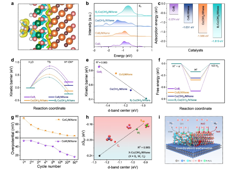 2/MXene 的 d 帶中心之間的關(guān)系(X = Bi 、 Wi 和 Ci)。 (i) MXene誘導氧陰離子協(xié)調(diào)動態(tài)增強HER的機制示意圖。