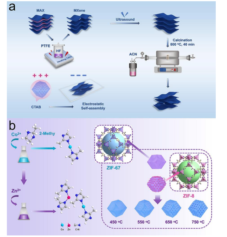 Fig 1. ZIF-67@ZIF-8 (a) 和 ZIF-67@ZIF-8/N-Ti