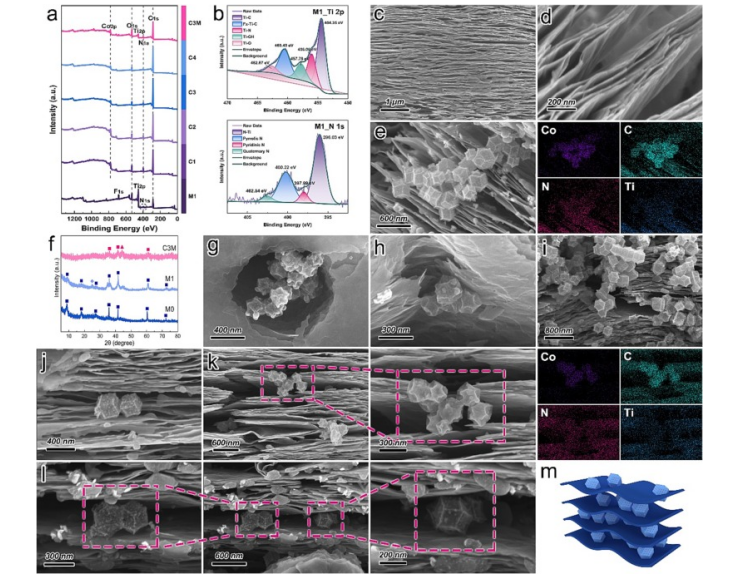 Fig 3. (a) 樣本 C0、C1、C2、C3、C4、M1 和 C3M 的 XPS 調(diào)查; (b)樣品M1的Ti 2p和N 1s; (c–d) 樣品 M1 的 SEM 圖像; (f) 樣品 M0、M1 和 CM2 的 XRD 圖; (e, g–l) 樣品 C3M 的 SEM 圖像和元素映射; (m) 樣品 C3M 的典型結(jié)構(gòu)仿真模型。