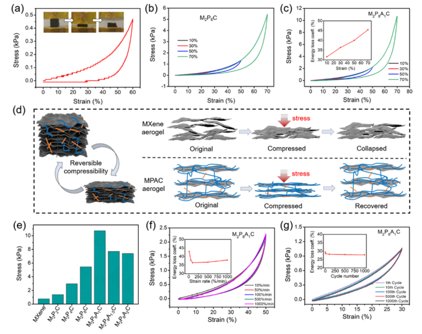 二維過渡金屬碳化物和氮化物(MXenes)由于其多用途的表面化學性質、高載流子遷移率、出色的金屬導電性以及在外加應力下可調節(jié)的層間間距,在氣凝膠柔性壓阻傳感器中顯示出巨大的潛力。然而,由于納米片之間的相互作用較弱,純MXene氣凝膠表現(xiàn)出顯著的塑性變形或脆性力學性能。本文采用雙向冷凍和退火策略,制備了一系列具有有序板層結構的MXene/聚酰亞胺/銀納米線復合氣凝膠。聚酰亞胺(PI)和銀納米線(AgNWs)的引入顯著改善了MXenes基氣凝膠的力學性能。所獲得的輕質復合氣凝膠具有超彈性、可逆性大、優(yōu)異的穩(wěn)定性和優(yōu)異的抗疲勞性。此外,由于復合氣凝膠的高度排列的板層微觀結構以及MXene和AgNWs優(yōu)異的電導率,復合氣凝膠表現(xiàn)出高靈敏度(規(guī)范因子~ 27.8)和超低檢測限(<0.6 Pa)的良好傳感性能?;贛Xene/PI/AgNW復合氣凝膠,展示了一系列可穿戴傳感器的應用。