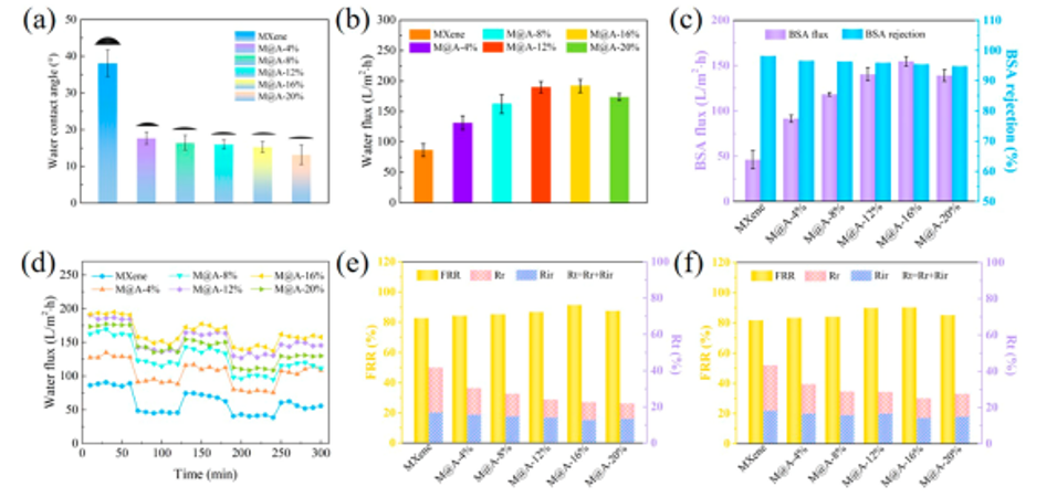 圖5。(a)純Ti3C2Tx MXene膜和M@A膜的水接觸角;(b)純Ti3C2Tx MXene膜和M@A膜的水通量;(c)純Ti3C2Tx MXene膜和M@A膜的BSA通量和排斥反應(yīng);(d)純Ti 3C2Tx MXene膜和M@A膜在BSA溶液中的時(shí)間依賴(lài)性通量;(e, f)分別為純Ti3C2Tx MXene膜和M@A膜的一、二污染指數(shù)和通量回收率。