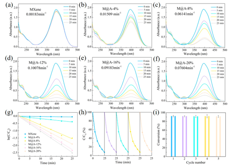 x MXene膜和M@A膜催化劑的反應(yīng)時(shí)間(min)與ln(C/C0)的關(guān)系。(h-i) M@A-12%膜催化劑用于4-NP催化還原反應(yīng)的循環(huán)催化。