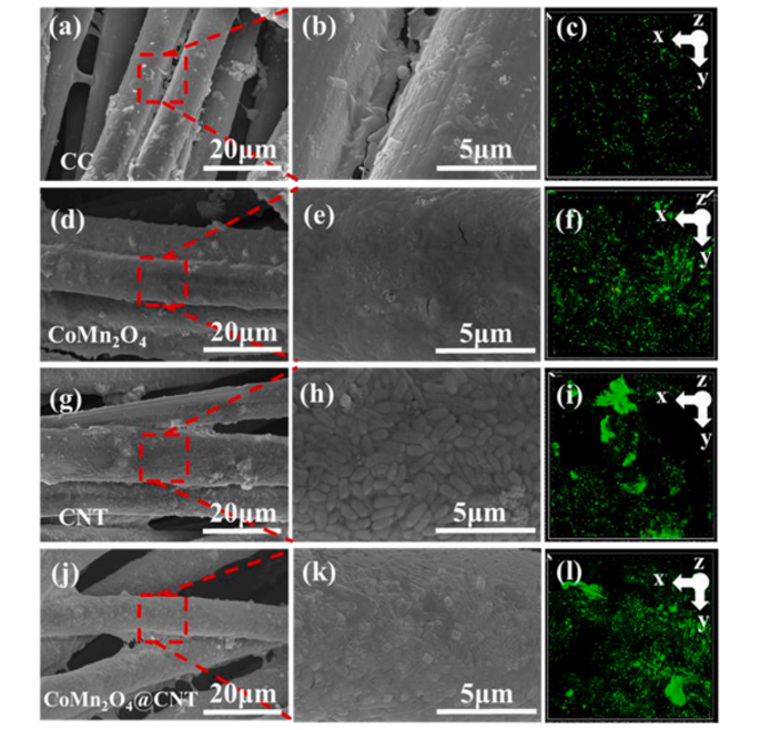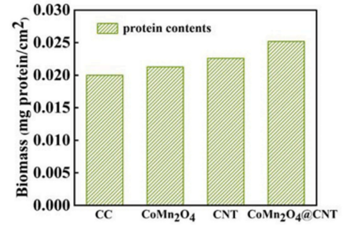 微生物燃料電池(MFCs)利用電活性微生物(EAMs)從有機(jī)廢水中回收電能,用于廢水處理和發(fā)電。然而,相對(duì)較低的功率輸出密度目前阻礙了MFCs的商業(yè)應(yīng)用。主要原因是陽(yáng)極界面微生物負(fù)荷低和細(xì)胞外電子傳遞(EET)緩慢。提高eam在陽(yáng)極上的負(fù)載和EET效率被認(rèn)為是提高mfc整體性能的有效策略。與原始碳布(CC)陽(yáng)極相比,CoMn