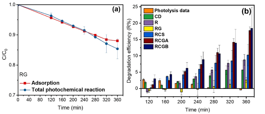 圖7. a) RG砂漿光催化降解亞甲基藍的In (C/C