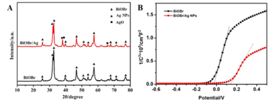 圖2. (A) BiOBr和BiOBr/Ag NP的XRD和(B) Mott–Schottky圖。
