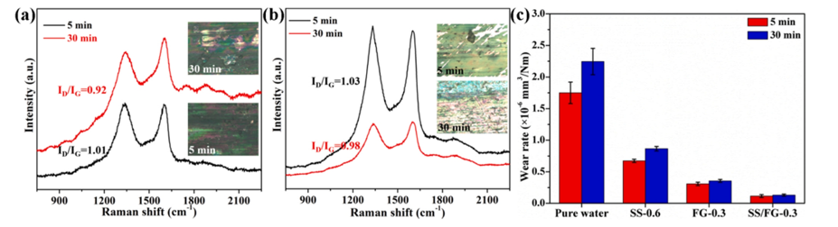 圖8. (a) FG/CTAC和(b)添加潤(rùn)滑劑的SS/FG潤(rùn)滑黃銅基片,摩擦5min和30 min后形成的潤(rùn)滑膜的拉曼光譜, (c)在設(shè)定條件下(20 N, 2 Hz, 6 mm)添加不同添加劑的潤(rùn)滑劑經(jīng)過(guò)不同摩擦次數(shù)后的磨損率比較。