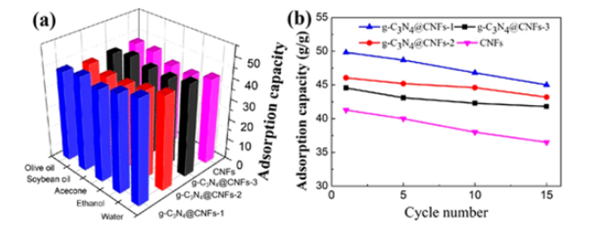 4@CNFs使其具有獨(dú)特的兩親性(水的接觸角在1.0秒內(nèi)接近0°,己烷的接觸角則在12毫秒內(nèi)接近0°)。超親水性對水和各種有機(jī)溶劑的高儲(chǔ)存能力g-C