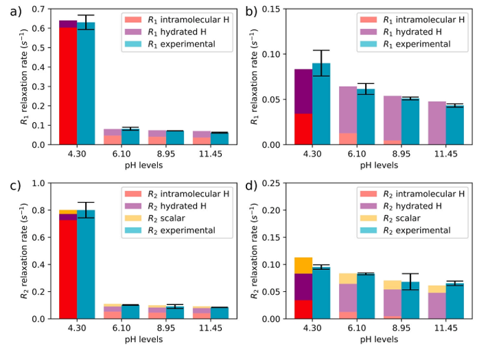 2弛豫速率,并確定了結(jié)合物質(zhì)為碳酸及其共軛物。一個物質(zhì)結(jié)合態(tài)和自由態(tài)弛豫速率有顯著差異,表明是可逆結(jié)合。除了弛豫速率外,還從小翻轉(zhuǎn)角實(shí)驗(yàn)中擬合了動力學(xué)速率常數(shù),并與理論計(jì)算進(jìn)行了比較。pH相關(guān)的吸附和解吸速率常數(shù)分別為3.5 ~ 9.5和0.7 ~ 2.0 s