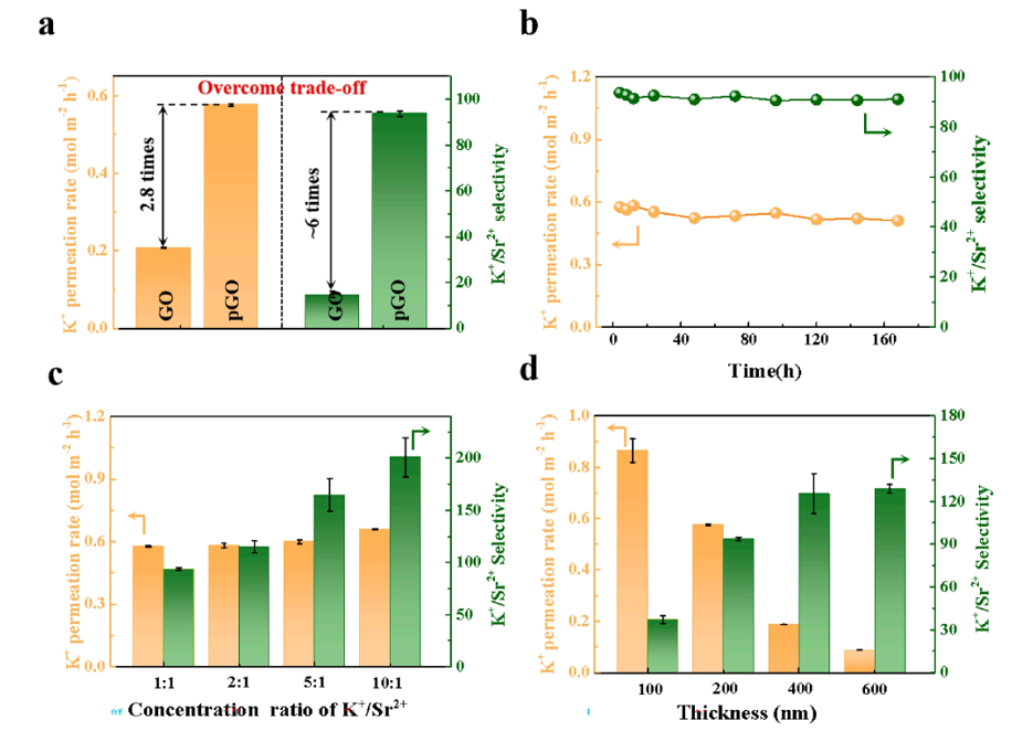 圖4. pGO膜在高酸溶液中的篩分性能。(a)GO和pGO膜的篩分性能比較。(b) pGO膜的長(zhǎng)期篩分性能。(c)不同K