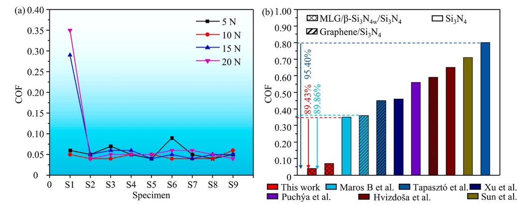 圖4. (a)不同荷載下試樣的COFs。(b) 本工作與其他報(bào)告研究之間的COF比較。