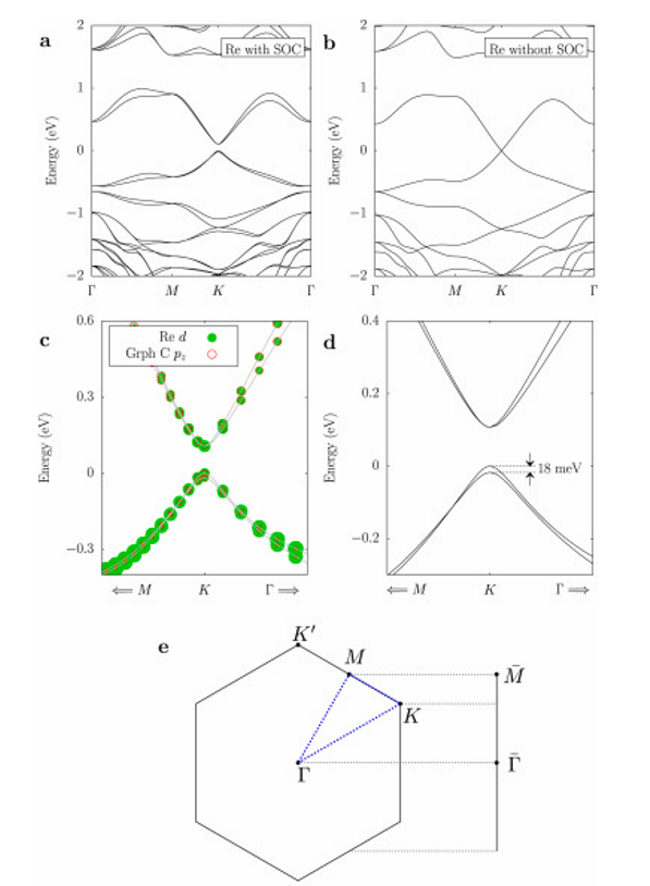 圖2. SiC上Re-插層外延石墨烯的電子能帶結(jié)構(gòu)。(a)帶SOC和(b)不帶SOC的能帶結(jié)構(gòu)。(c) Re