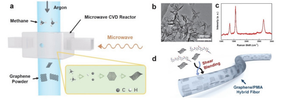 Fig 1. (a) 微波誘導(dǎo)石墨烯制造工藝方案; (b,c)所制備的石墨烯粉末的低倍TEM圖像和相應(yīng)的拉曼光譜; (d)石墨烯/PMIA纖維的示意圖。