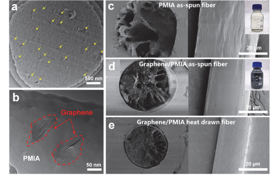 Fig 2. (a) 石墨烯/PMIA 纖維橫截面的 TEM 圖像。黃色箭頭突出顯示了均勻分散的石墨烯的存在; (b) HRTEM 圖像顯示分散在 PMIA 基質(zhì)中的石墨烯的詳細形態(tài); (c-e) 熱拉伸后PMIA初紡纖維、1%石墨烯/PMIA初紡纖維和1%石墨烯/PMIA纖維的橫截面和表面的SEM圖像。插圖:PMIA 聚合溶液 (c) 和石墨烯/PMIA 共混聚合溶液 (d) 的光學(xué)照片。圖1(a)微波誘導(dǎo)石墨烯制備工藝示意圖; (b,c)所制備的石墨烯粉末的低倍TEM圖像和相應(yīng)的拉曼光譜; (d)石墨烯/PMIA纖維的示意圖。