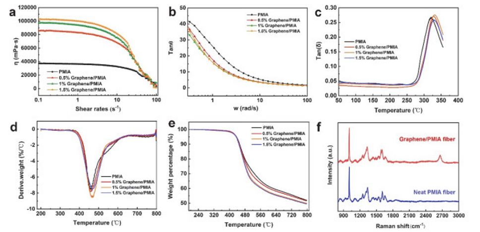 Fig 3. (a) 純 PMIA 和石墨烯/PMIA 溶液在 40 °C 下的穩(wěn)態(tài)流變行為和 (b) 損耗因子; (c) PMIA和石墨烯/PMIA共混纖維的DMA曲線; PMIA 和石墨烯/PMIA 纖維的 (d) DTG 曲線、(e) TG 曲線和 (f) 拉曼光譜。