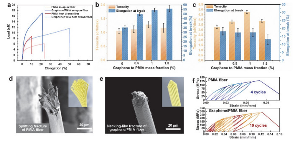 Fig 4. (a) PMIA纖維和石墨烯/PMIA纖維的典型應(yīng)力應(yīng)變曲線;不同石墨烯含量的初紡(b)和熱拉伸(c)石墨烯/PMIA纖維的平均最大拉伸強度和斷裂伸長率; PMIA纖維(d)和石墨烯/PMIA纖維(e)拉伸斷裂形貌比較; (f)準(zhǔn)靜態(tài)循環(huán)加載條件下PMIA纖維和石墨烯/PMIA纖維的應(yīng)力應(yīng)變曲線。