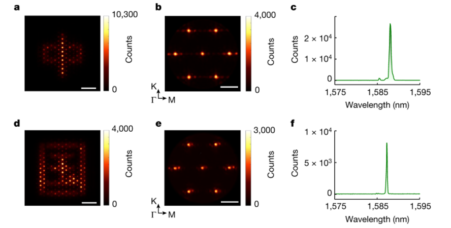 Fig 3. 相干 P 形和 K 形莫爾納米激光陣列。a,b,P 形莫爾納米激光陣列在實空間 (a) 和動量空間 (b) 中的自發(fā)發(fā)射圖案。比例尺,10 μm (a), 1.6 μm