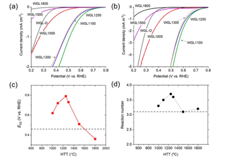 O2)-HTT依賴性。(d) 反應(yīng)中涉及的電子數(shù)量(n)(在0.1V下與可逆氫電極相比)–HTT依賴性。(c)和(d)中的虛線表示W(wǎng)GL-O的相應(yīng)值。