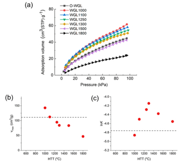 圖6. WGL HTs的氧吸附性能評(píng)估:(a)氧吸附等溫線,(b)飽和吸附量(V