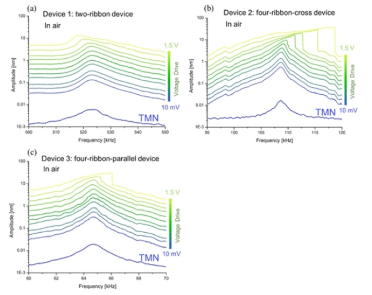 圖2. 測(cè)量了設(shè)備1-3的頻率響應(yīng),以及增加壓電振動(dòng)器驅(qū)動(dòng)電壓的振幅和空氣中的熱機(jī)械噪聲(TMN)測(cè)量值(a–c)。裝置1-3的壓電振動(dòng)器施加的驅(qū)動(dòng)電壓(在10 mV和1.5 V之間)相同。