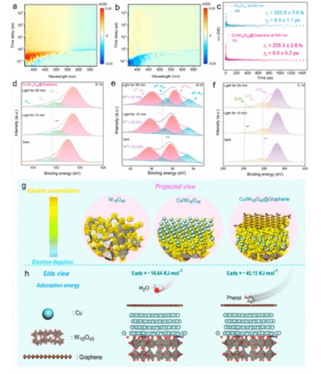 49內(nèi)的氧空位,同時促進(jìn)熱電子提取,有效緩解其超快弛豫。密度泛函理論計算表明,揮發(fā)性有機(jī)物在石墨烯上的吸附增強(qiáng)。這些協(xié)同作用解決了W