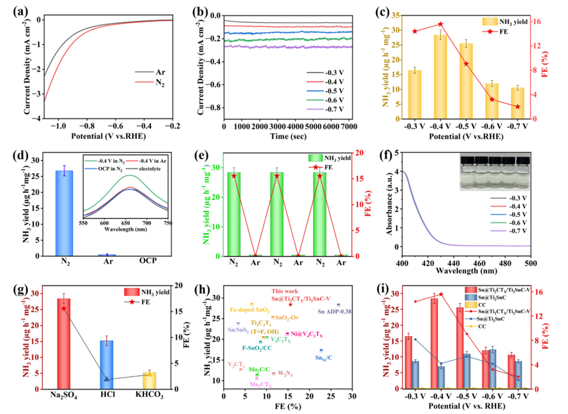 圖3. a Sn@Ti2CTX/ Ti2SnC-VC-V在Ar-和N2-飽和0.1 M Na2SO4中的LSV曲線。b Sn@Ti2CTX/ Ti2SnC-V在N2飽和的0.1 M Na2SO4中不同電位下的CA結(jié)果。在選定的電位下NH3產(chǎn)率和FEs。d不同控制條件下電解2h后的電解液NH3產(chǎn)率及相應(yīng)的紫外-可見吸收光譜(見圖)。e在-0.4 V(相對(duì)于RHE)下,在N2和Ar飽和的電解液中交替循環(huán)2 h,分別得到Sn@Ti2CTX/ Ti2SnC-V的NH3產(chǎn)率和FEs。f電解液在瓦特和克里斯普法確定的選定電位下進(jìn)行2小時(shí)ENRR測(cè)試后的紫外可見吸收光譜。附圖為該指示劑與N2H4·H2O的顯色反應(yīng)。在−0.4 V(相對(duì)于RHE)下,Sn@Ti2CTX/ Ti2SnC-V在不同電解質(zhì)中的NH3產(chǎn)率和FEs。不同Sn和mxene基ENRR催化劑的NH3產(chǎn)率和FE圖[1、2、3、4、5、6、7、8、9、10、11、12]。i在相應(yīng)電位下,在N2飽和的0.1 M Na2SO4電解液中Sn@Ti2CTX/ Ti2SnC-V、Sn@Ti2SnC和CC的NH3產(chǎn)率和fe。
