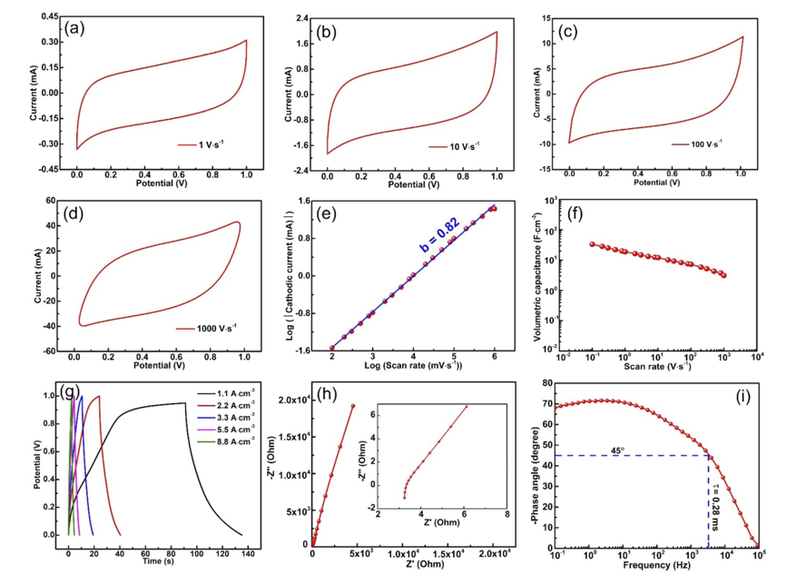 圖4. 基于Ti 3 C 2 T x QDs 的 MSC 在 1 M KOH 電解質(zhì)中不同掃描速率下的 CV 曲線:(a) 1 V·s -1,(b) 10 V·s -1,(c) 100 V· s -1、(d)分別為1000V ·s -1。(e) 固定電勢(shì) (0.5 V) 下的陰極電流對(duì)數(shù)對(duì)掃描速率對(duì)數(shù)的依賴性 。(f) 基于 Ti 3 C 2 T x QDs 的 MSC 的體積電容作為掃描速率的函數(shù)。(g) 獲得的MSC在不同恒流密度下的GCD曲線??。(h) 基于 Ti 3 C 2 T x QDs 的 MSC 的奈奎斯特圖。(h) 中的插圖是相應(yīng)的部分放大奈奎斯特圖。(i) 阻抗相位角與頻率的關(guān)系圖。