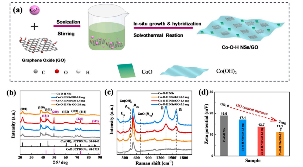 2 (JCPDS No. 30-0443),粉色豎線代表CoO (JCPDS No. 48-1719), (c)制備的Co-O-H NSs/GO-x和Co-O-H NSs. 的拉曼光譜和(d) zeta電位。