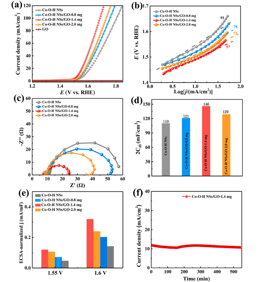 -1,使其與最先進(jìn)的Co-非自支撐電催化劑相當(dāng)。綜合分析表明,Co-O-H NSs/GO-1.4 mg具有優(yōu)異的OER電催化性能,這可能歸因于其電活性表面積的增加(雙層電容約為146 mF.cm
