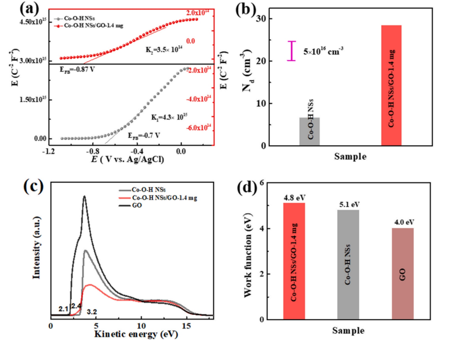 4溶液中 Co-O-H NSs和Co-O-H NSs/GO-1.4 mg以1000 Hz固定頻率記錄的Mott-Schottky圖和(b)它們對(duì)應(yīng)的從(a)中提取的載流子濃度;(c) Co-O-H NSs、Co-O-H NSs/GO-1.4 mg和GO的UPS光譜和(d)從(c)中估計(jì)的它們對(duì)應(yīng)的功函數(shù)。