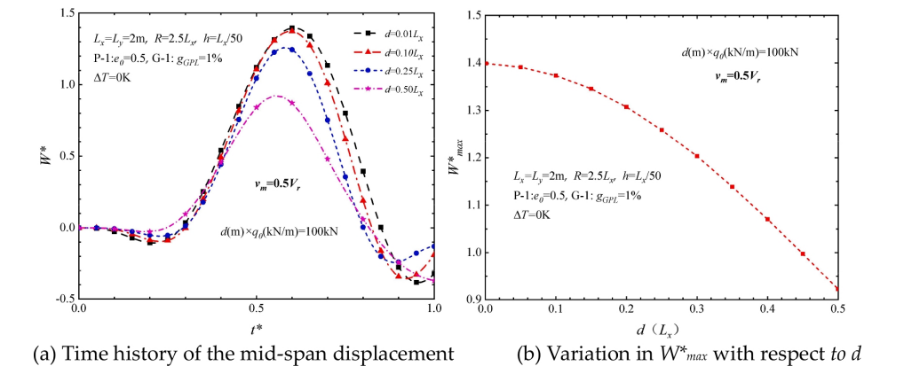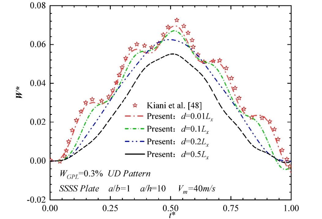 本文是作者所知的對非線性溫度多孔梯度石墨烯納米板增強復合材料(FG-GPLRC)圓柱板在移動分布載荷作用下的動態(tài)響應進行的第一次探索。通過合理設計內(nèi)部孔徑和GPL色散模式,可以獲得理想的多孔FG-GPLRC結構。采用Halpin-Tsai細觀力學模型、擴展混合規(guī)則和開孔金屬泡沫模型,引入等效熱-力學參數(shù),建立了多孔FG - GPLRCs的溫度依賴動力學模型。在一階剪切變形理論和標準拉格朗日方程的基礎上,借助von Kármán幾何非線性建立了納米復合材料柱狀板的非線性運動控制方程。此外,還實現(xiàn)了一個封閉形式的Navier解建立簡支邊緣結構模型。最后,使用Newmark直接積分法結合Newton-Raphson迭代法確定非線性動力響應。參數(shù)分析結果表明,該模型能較好地預測溫度依賴性多孔FG-GPLRC圓柱板屈曲行為及瞬態(tài)動力響應。研究還發(fā)現(xiàn),在面板的中表面附近分散更多的GPLs和制造更多的內(nèi)部孔隙可以大大降低移動載荷引起的響應幅值,并且具有較短長度的移動分布載荷可以產(chǎn)生更高的響應。