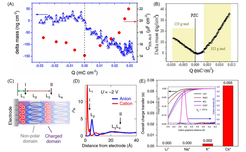 − 的 (C) 離子排列和 (D) 離子數(shù)密度。 (E) 1.00 M LiCl、NaCl、KCl、CsCl 水溶液中從水合陽離子到石墨烯電極的總電荷轉(zhuǎn)移,通過對每個離子的電荷轉(zhuǎn)移和局部陽離子密度進行積分計算得出,該密度源自勢能表面的玻爾茲曼權(quán)重石墨烯電極,均在插圖中。