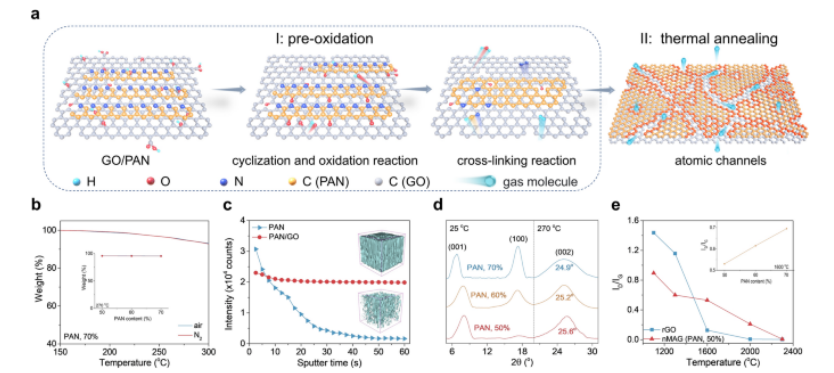 Fig 2. PAN 衍生的原子級氣體逃逸通道。 a GO/PAN中原子通道形成示意圖。 b GO/PAN (PAN, 70%) 在氮氣和空氣氣氛中的 TGA 圖;插圖顯示了在氮氣和空氣中加熱至 270 °C 的具有不同 PAN 含量的 nMAG 的殘余質(zhì)量。 c 600 nm 厚的預氧化 GO/PAN 薄膜(PAN,70%)和 PAN 薄膜中氧元素的 ToF-SIMS 元素深度剖面,及其相應(yīng)的氧 3D 映射圖像(插圖)。 d 不同PAN含量的GO/PAN薄膜在270℃預氧化前后的X射線衍射圖。 e 在不同溫度下熱處理的 nMAG (PAN, 50%) 和 rGO 的