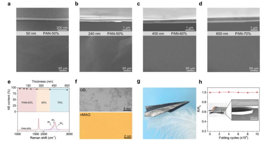 Fig 3. nMAG 的結(jié)構(gòu)和靈活性。 50 nm 厚 nMAG 的 HR-TEM(橫截面,向上)和 SEM(表面,向下)圖像。 b-d 不同厚度的 nMAG 的橫截面和表面 SEM圖像。 e 不同厚度 nMAG 的 AB 含量(上)和 50 nm 厚 nMAG 的拉曼光譜(下)。 f GO 的 HR-TEM 圖像(上)和 nMAG 的 STM 形貌圖像(下)。 g 用 600 nm 厚的 nMAG 折疊的紙飛機。 h 600 nm厚的nMAG反復折疊后的電阻變化。