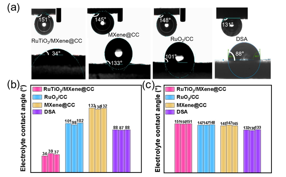 2 /MXene@CC 和 DSA 的(a)接觸角測量照片,(b)電解質(zhì)接觸角,(c)氯接觸角。