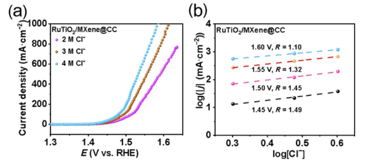 2、MXene@CC 和 DSA 在 4 M NaCl (pH = 2) 下的 LSV 曲線。 (b) RuTiO