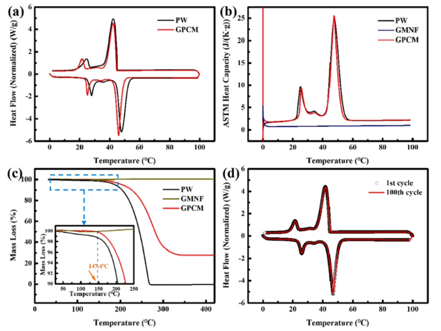 圖3. (a) PW和GPCM的DSC曲線;(b)PW、GMNF、GPCM的比熱容曲線;(c)PW、GMNF、GPCM的TG曲線;(d)100次循環(huán)試驗(yàn)前后GPCM的DSC曲線。
