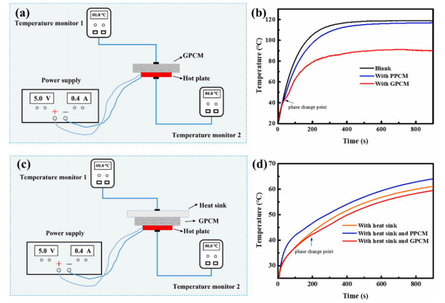 圖4. (a)GPCM和PPCM附著在熱板上時(shí)的模擬實(shí)驗(yàn)設(shè)置示意圖;(b) 圖a中熱板相應(yīng)的溫度變化;(c)GPCM和PPCM作為TIMs時(shí)的模擬實(shí)驗(yàn)設(shè)置示意圖;(d)圖c中熱板相應(yīng)的溫度變化。