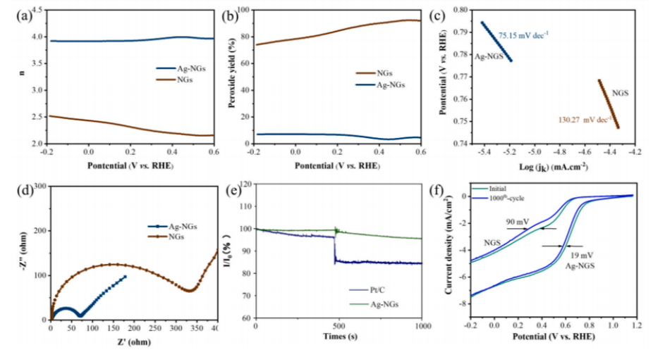 2產(chǎn)率與電位的關(guān)系;(c)Tafel圖;(d)EIS圖;(e)Ag - NGs和Pt/C的抗甲醇中毒能力;(f)NGs和Ag - NGs在1000個(gè)電位循環(huán)前后的LSV曲線。